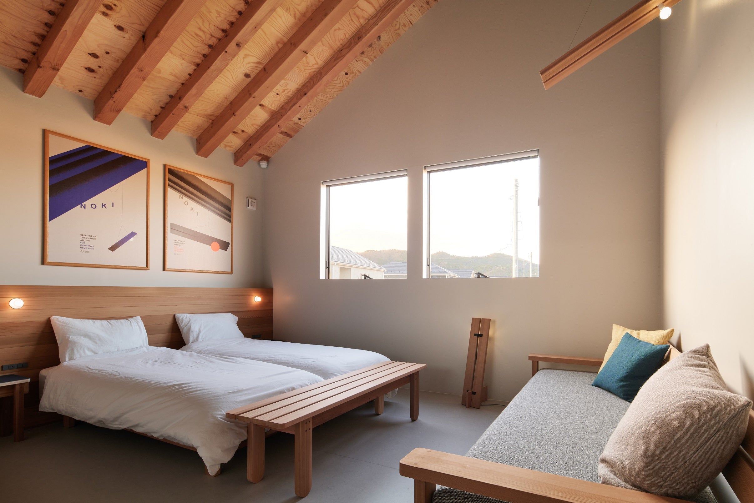 2020年、石巻工房からほど近い場所にオープン。1階にはショールームやイベントを行う多目的スペース、2階にはゆかりの建築家・デザイナーが手掛けたゲストルームが4室あり、実際にご宿泊いただけます。